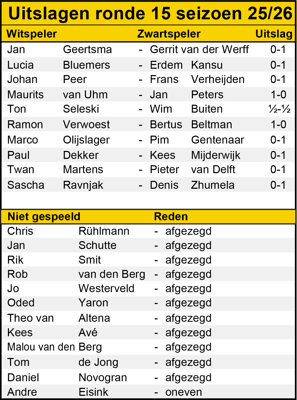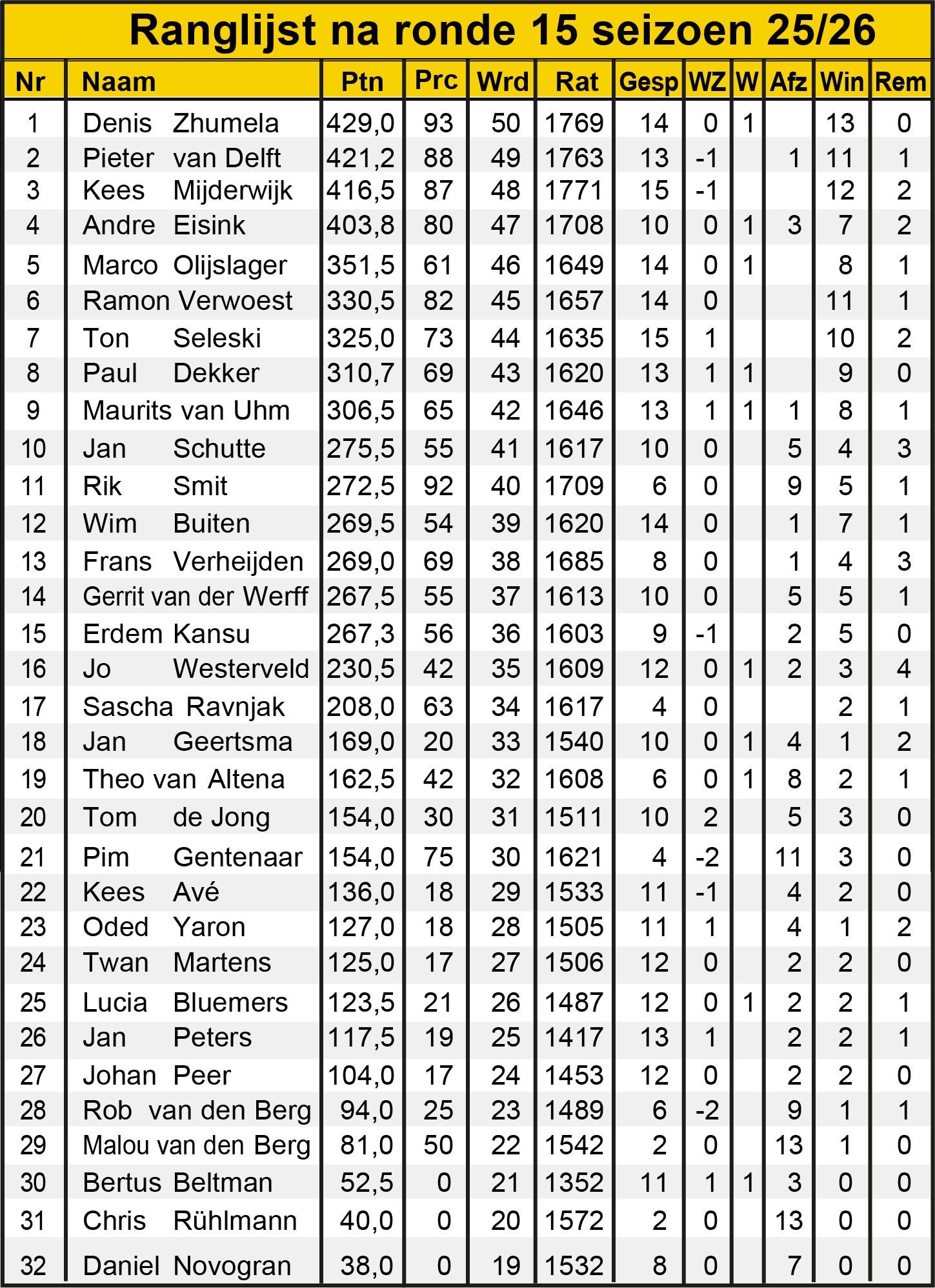 Hieronder de stand in de interne competitie van de Ruurlose schaakvrienden.