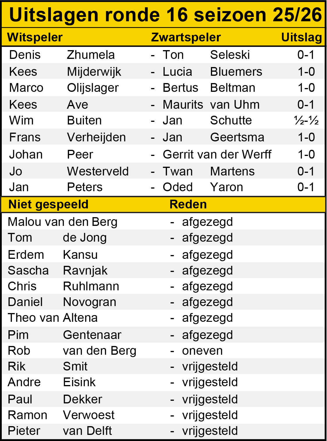 Hieronder de uitslagen van weer een spannende ronde