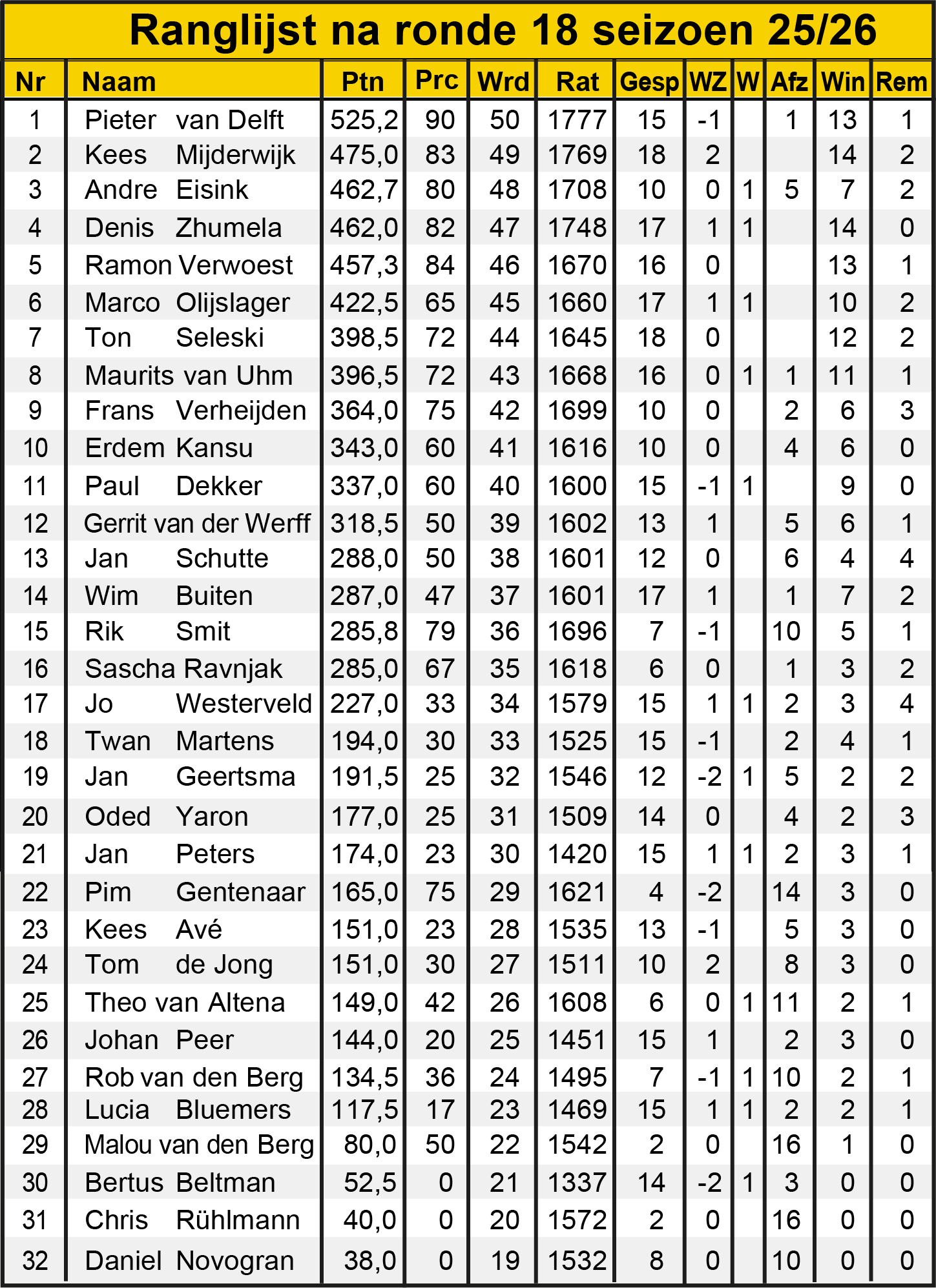 Hieronder de stand in de interne competitie van de Ruurlose schaakvrienden.