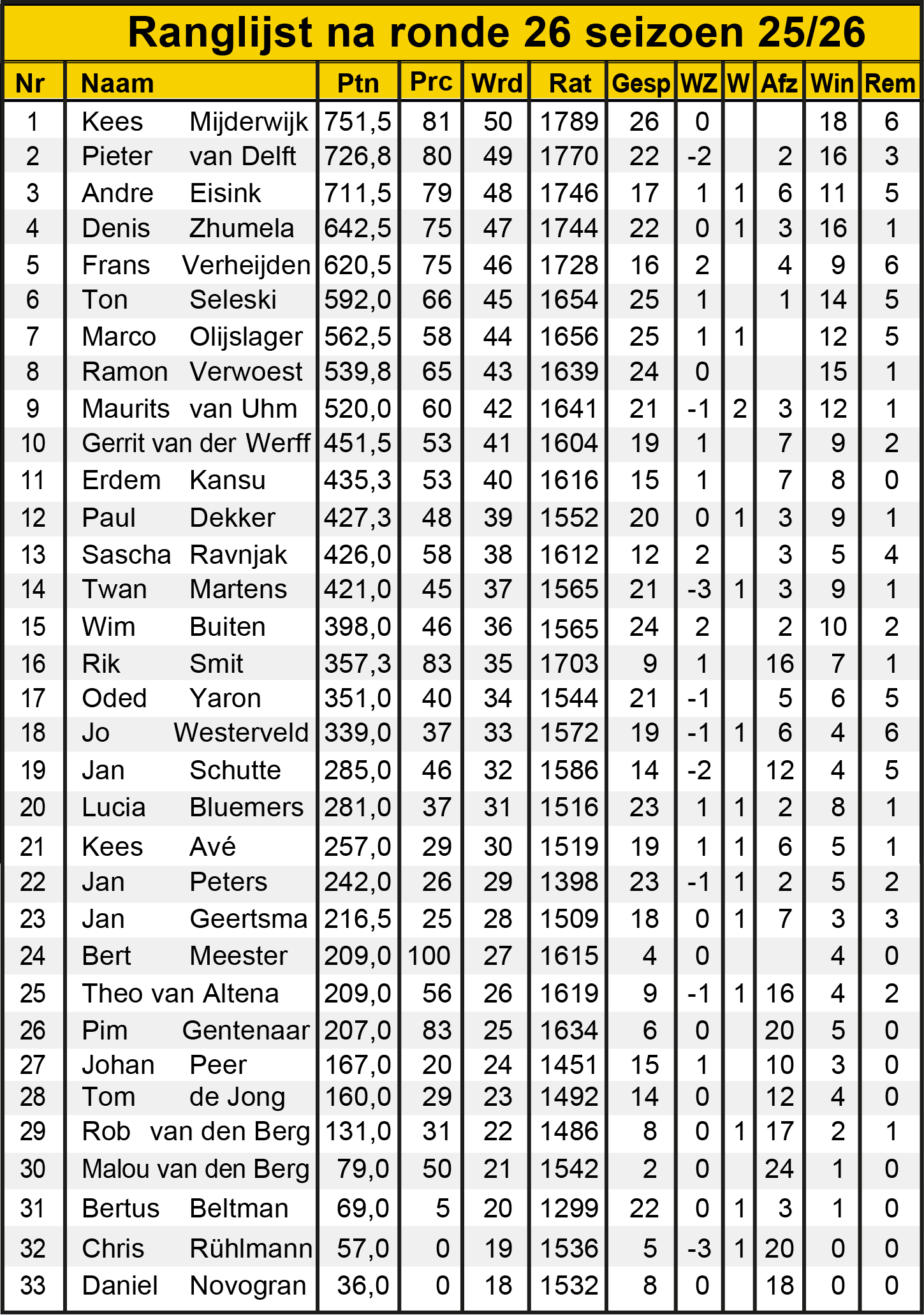 Ronde 26: ranglijst