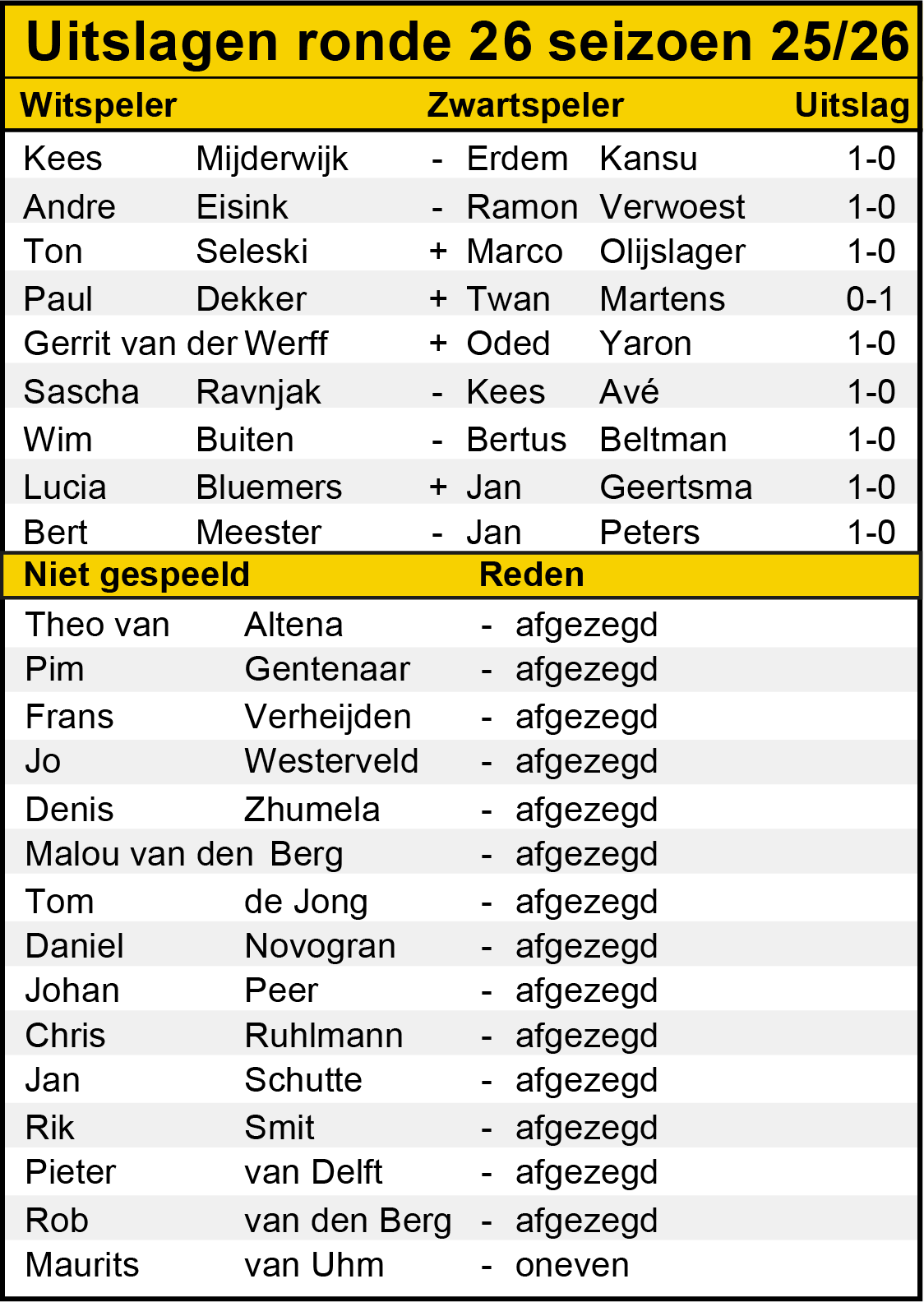 Hieronder de uitslagen van weer een spannende ronde