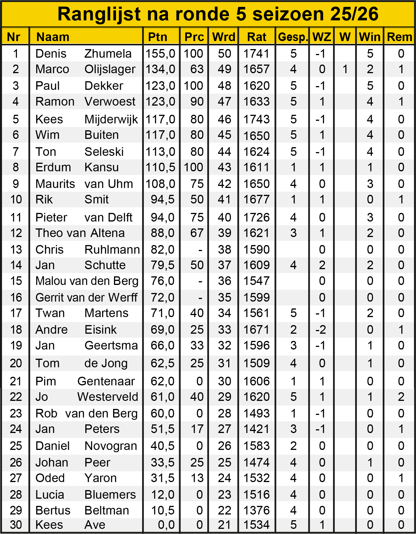 Hieronder de stand in de interne competitie van de Ruurlose schaakvrienden.