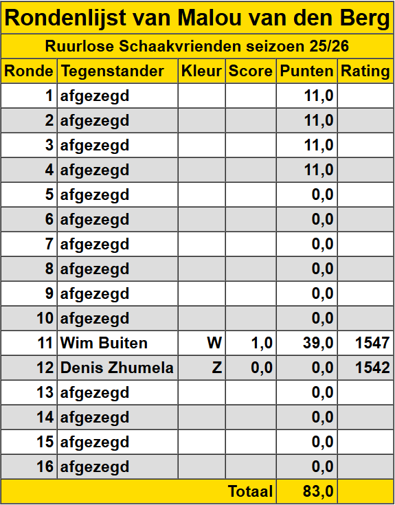 Gebruik onderstaande adresgegevens voor contact met Mevr. Lucia Bluemers ’t Gotink 33 7261 VE Ruurlo Tel. 0573453815 lucia@ruurloseschaakvrienden.nl