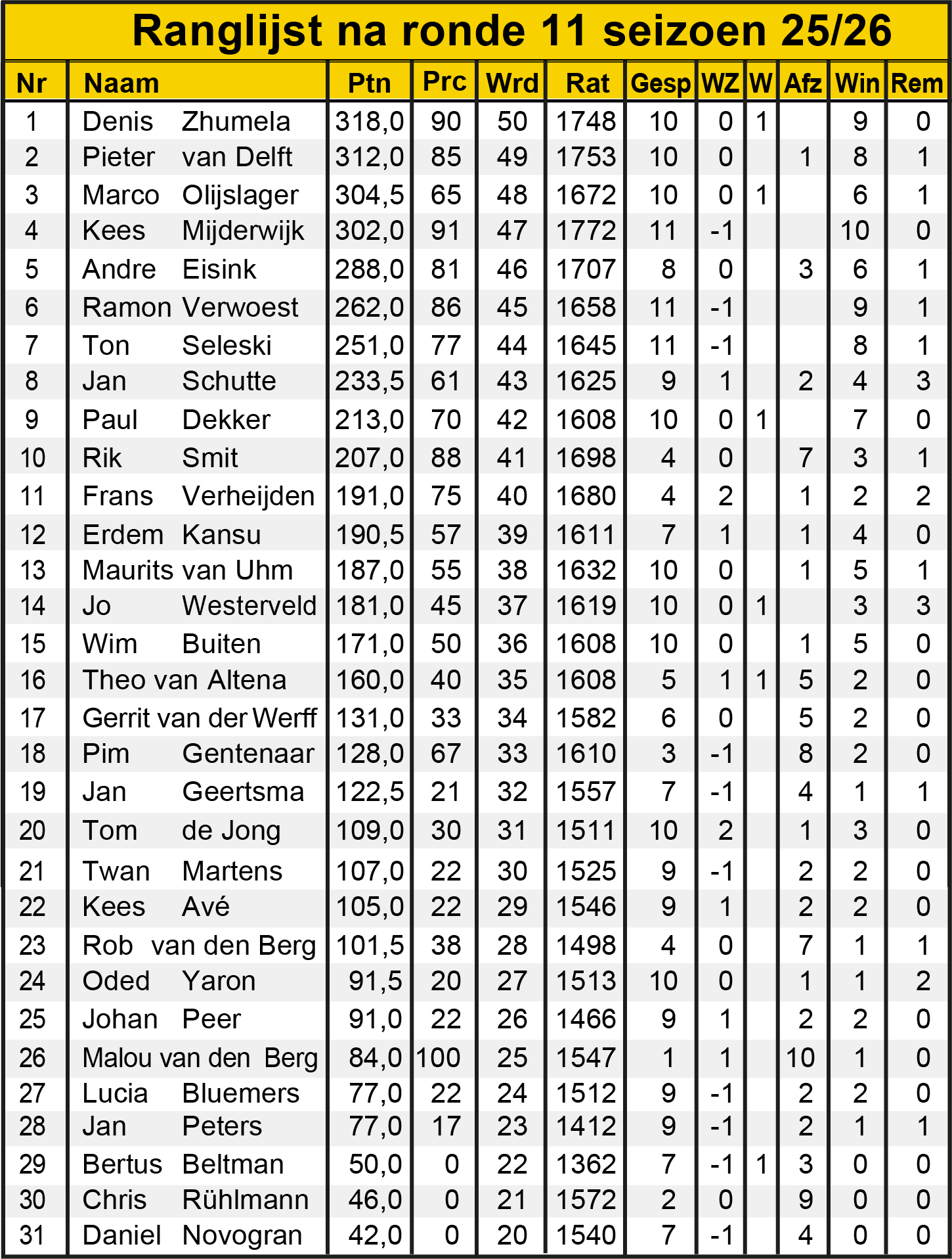 Ronde 11: ranglijst
