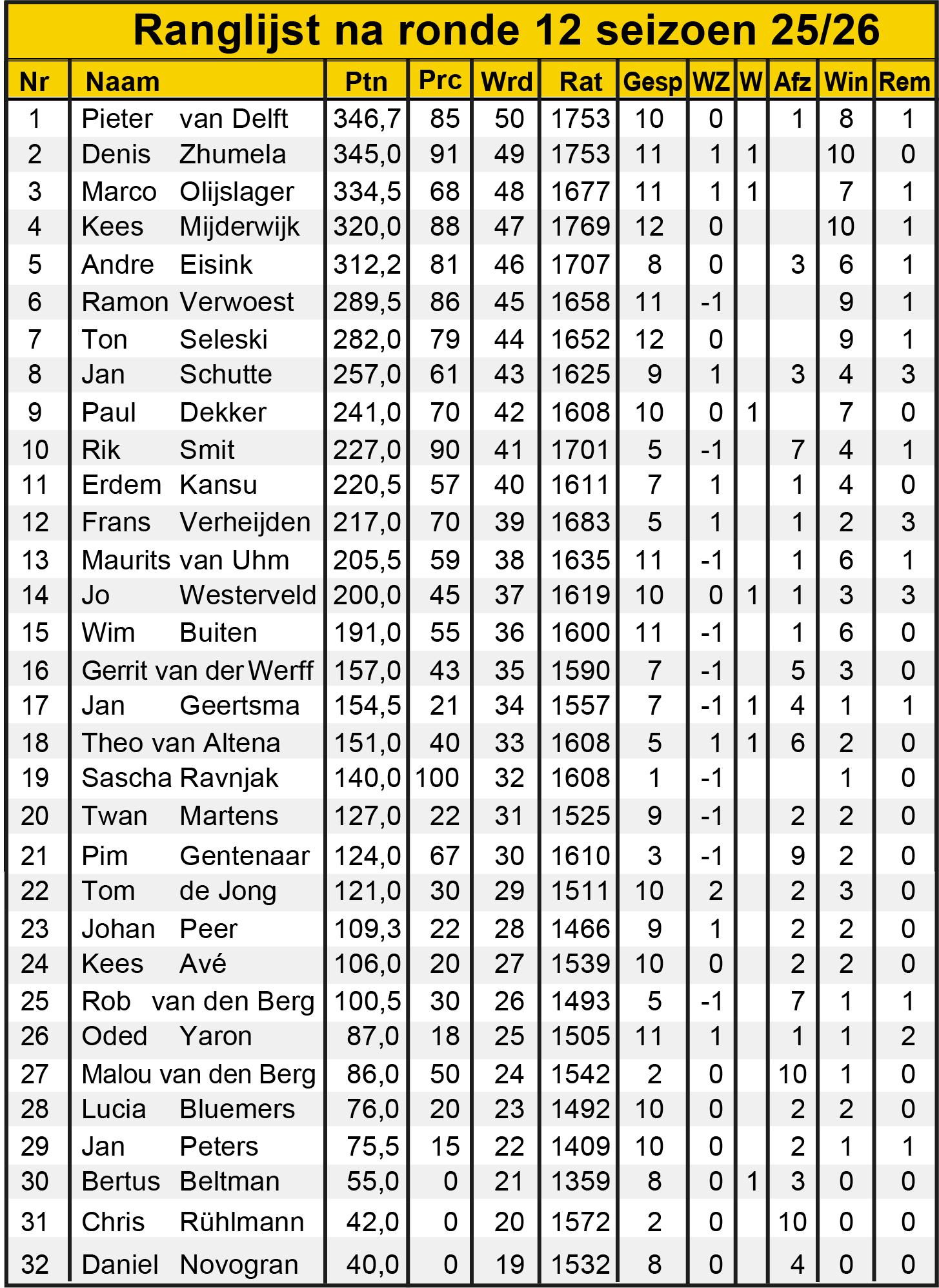 Ronde 12: ranglijst