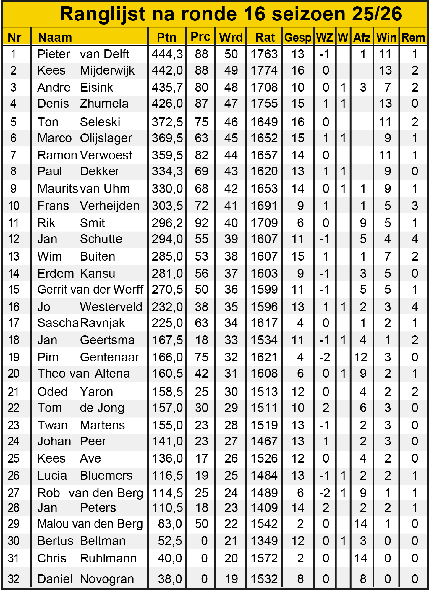 Ronde 16: ranglijst