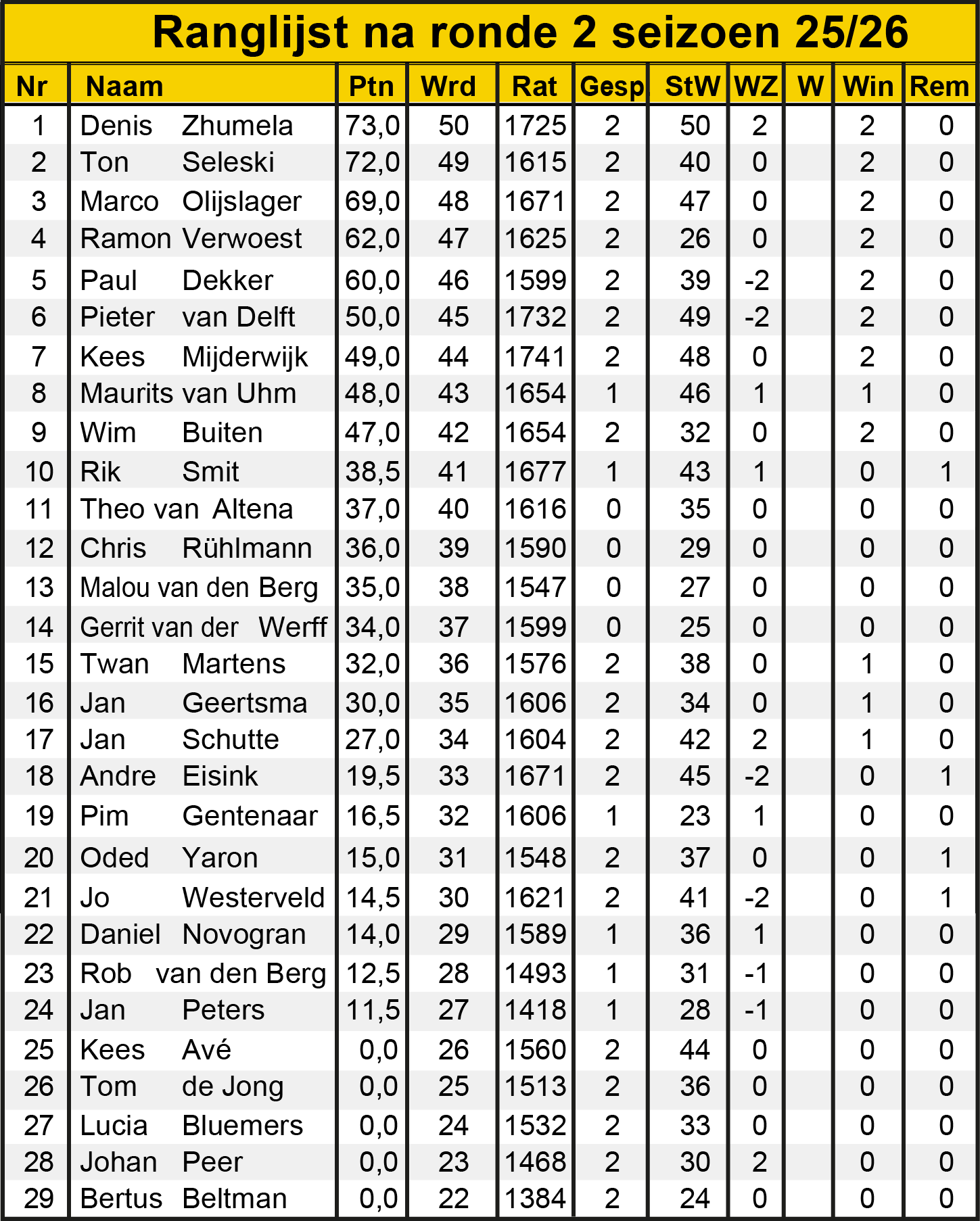 Ronde 2: ranglijst