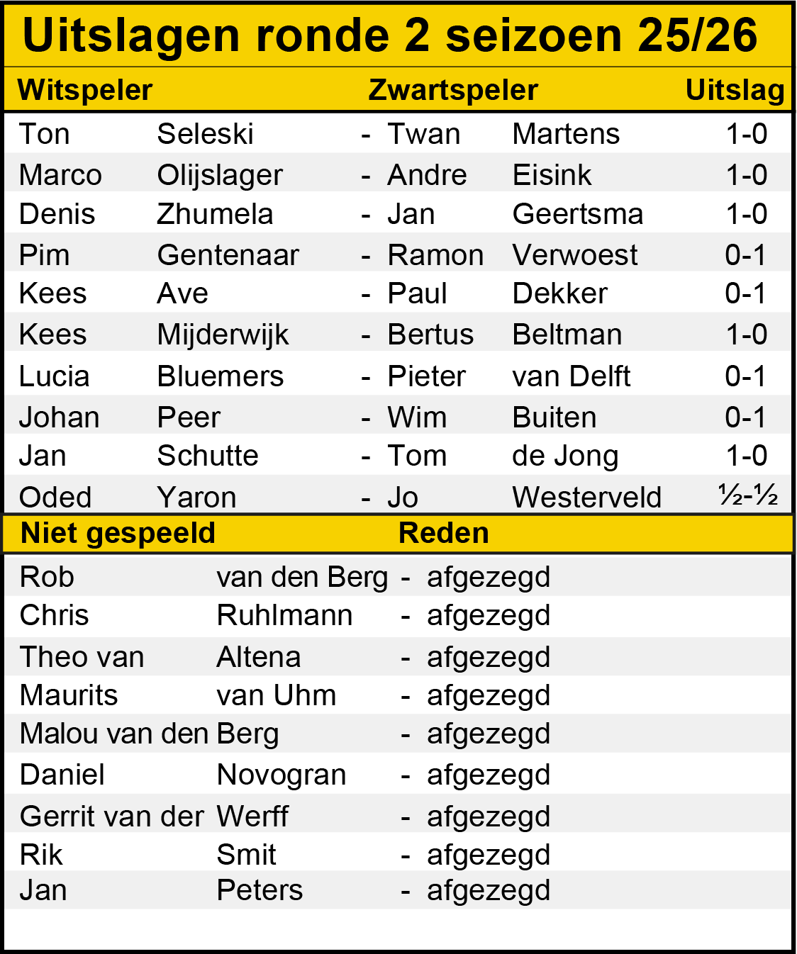 Hieronder de uitslagen van weer een spannende ronde