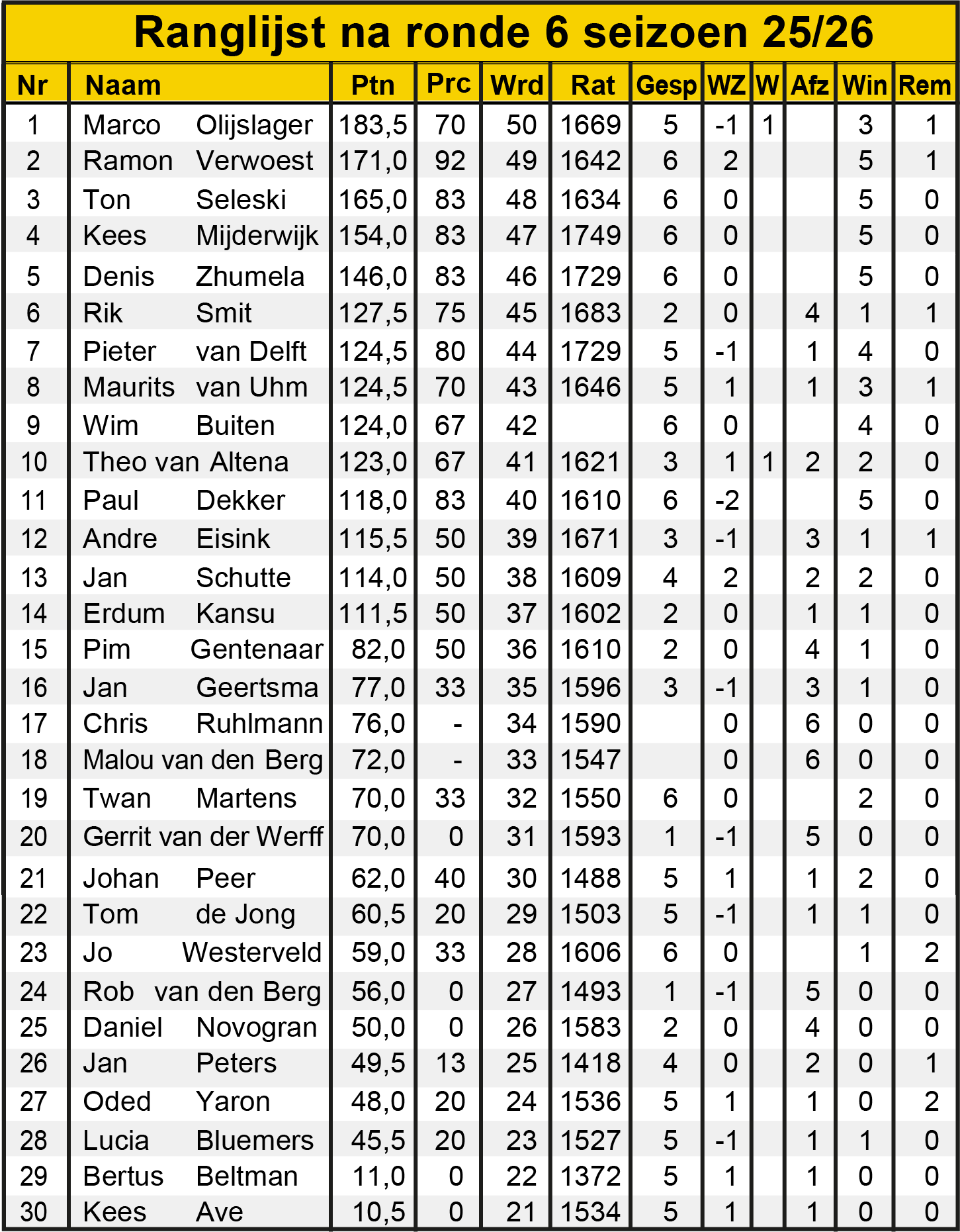 Ronde 6: ranglijst
